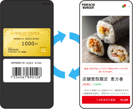 P+KACHIシステム(リアル店舗のポイント)とのポイント発行/利用の連携が行えます。